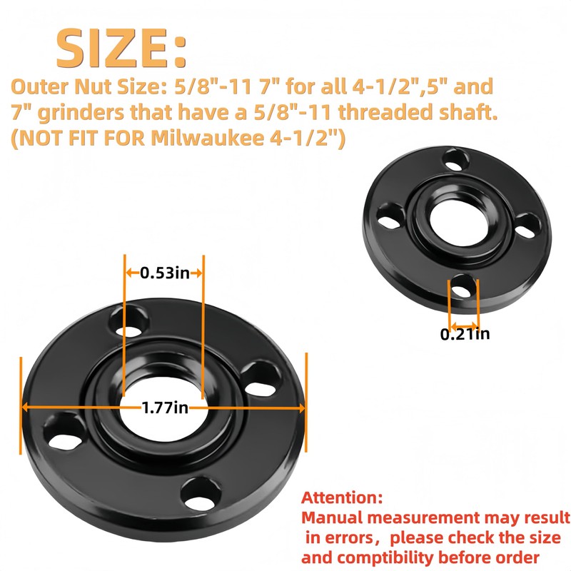 - Outer Nut Size: 5/8"-11 7" for all 4-1/2",5" and 7" grinders that have a 5/8"-11 threaded shaft. (NOT FIT FOR Milwaukee 4-1/2'')