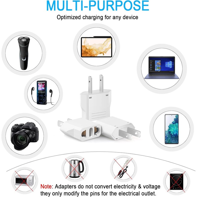 - [MULTI-PURPOSE]: These plug converter Europe to USA are very small electrical adapter plugs, perfect for charging Smart phones, Bluetooth speakers, cameras, tablets, shavers, headphones, laptops and so on. (Note: This is not a voltage converter; These plug adapter Europe to us is only compatible for 110V to 250V wide voltage device)