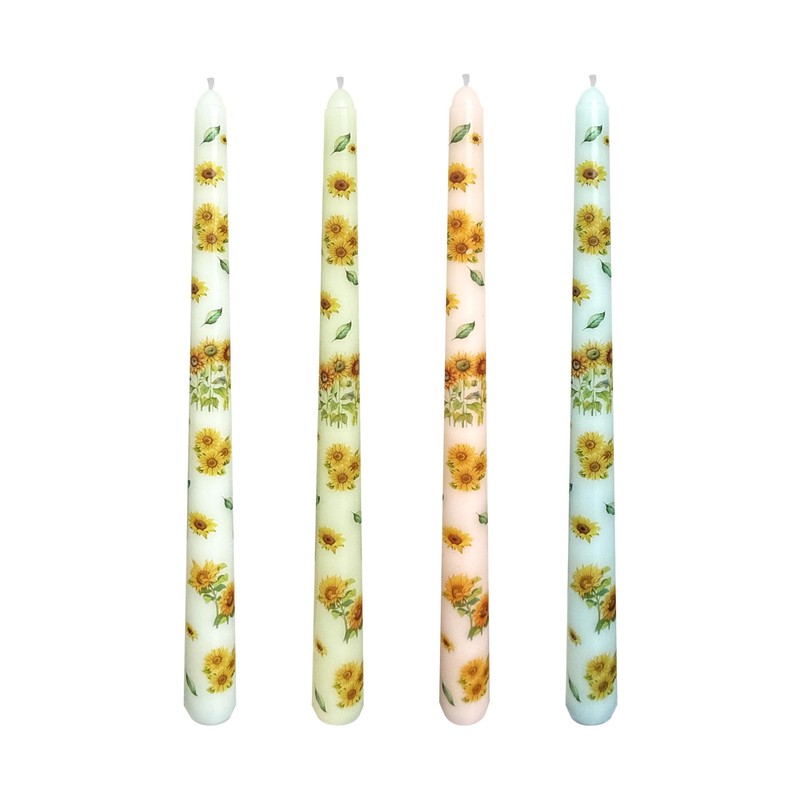 4-Pack Printed Taper Candles Unscented - Dripless & Smokeless 7-Hour Burn - 10" Hand-Poured Candles with Sunflower Design for Dining, Weddings (White/Pastel Yellow/Pink/Blue)