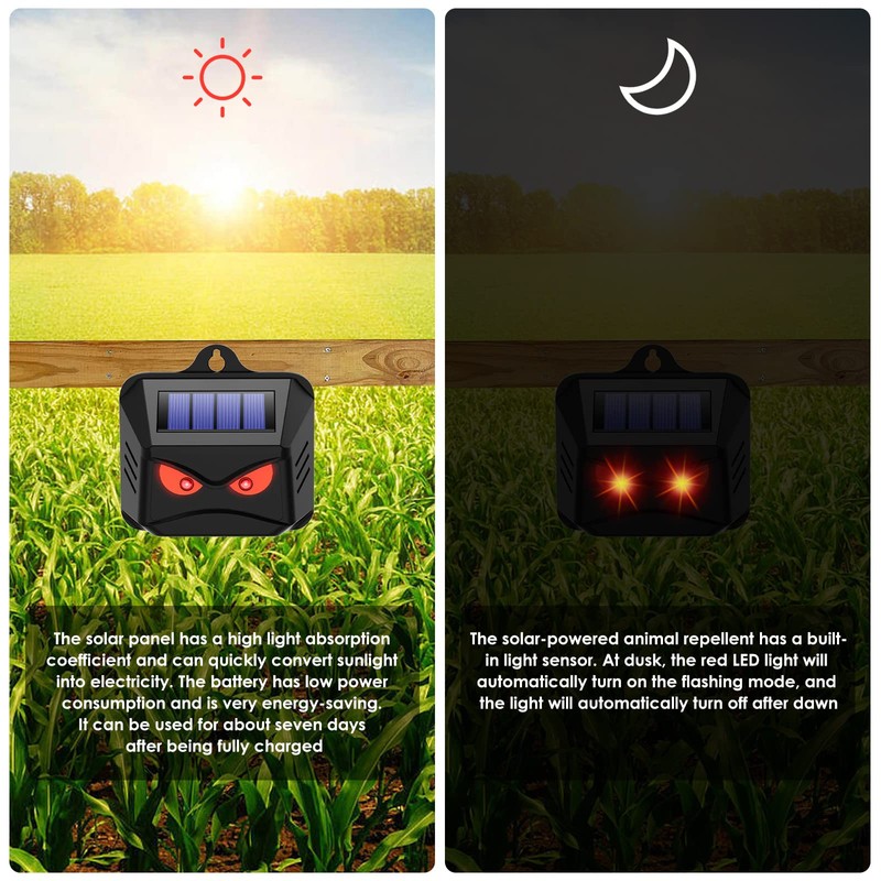 - Solve 99% of Animal Invasion Worries: Science has proven that homoiothermal animals are afraid of fire. Animals may choose to flee when a fire or similar is detected. The solar animal repeller is designed to drive animals by flashing red light based on this theory which scare most animals invaders away from your garden, yard, farm, vegetable fields, and chicken coop