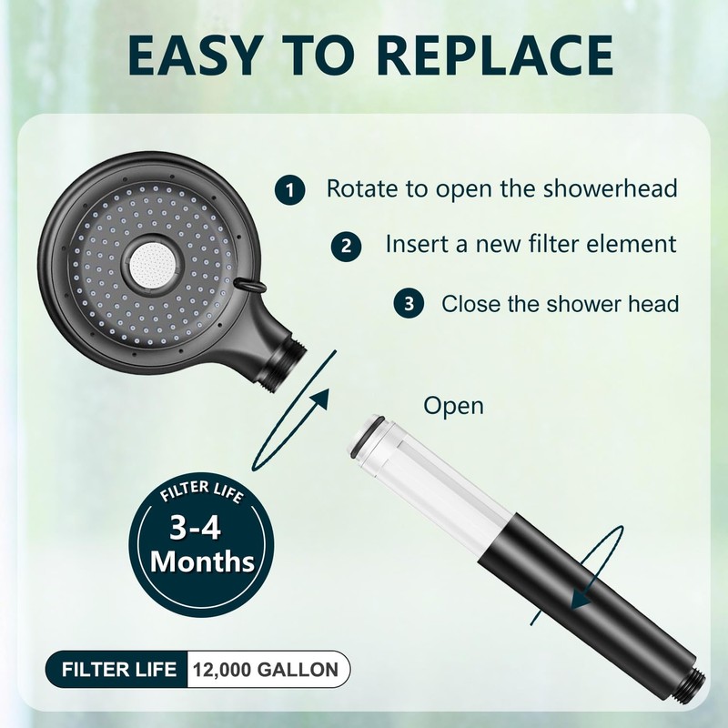 4. The replacement isconvenient and fast. 1. Remove the shower. 2. Take out the used filter element.3. Put in the newfilter element. 4. The assembly is complete.