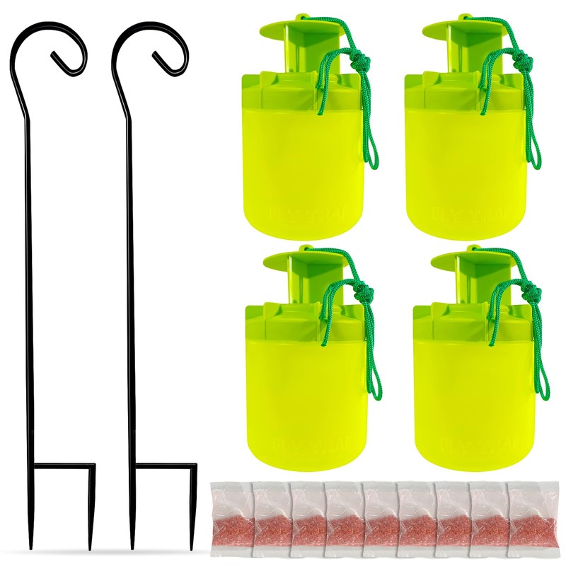 Outsmart Flies Where They Thrive Flies are drawn to moisture, food sources, and warm environments – making your outdoor spaces a prime target. Our fly trap disrupts their natural behavior with a targeted solution that’s as tough as the pests themselves. Key Features: 1.Fast-Acting & Effective – Starts working within 48 hours. Lures flies to drown in the trap—continuous, mess-free pest control. 2.Adjustable Shepherd Hooks Included - Comes with two 32.28-inch hooks for flexible placement. Easily push into soil, sand or grass and hang your trap—effortless setup for any outdoor space. 3.Reusable & Weatherproof Design - Combines durability with all-weather performance. Made from UV-resistant materials to withstand sun, rain and wind. Simply empty, rinse and reload for season-long use—no replacement needed. 4.Safe for Families & Pets – Uses non-toxic, food-grade bait formula (shrimp powder, wheat embryo induction, snow potato flour, etc.)—harmless when used as directed. 5.Quick & Easy Setup – Ready in minutes: Add bait pack and warm water, swirl to mix, and hang. No tools or complex assembly needed. (Tip: Refill water if it dries in hot weather.) 6.Optimized Outdoor Placement – Designed for open areas (gardens, patios, yards). Place at least 20 feet from living spaces for best results. 7.Complete Ready-to-Use Kit – Includes: 1 reusable trap bottle 1 attractant bait pack 1 windproof hanging cord How It Works: Flies are attracted to the trap’s activating solution Insects enter through the inverted funnel design Trapped flies are contained within the reservoir Ideal For: Backyard gatherings Equestrian facilities Compost areas Trash bin zones Garden perimeter defense Maintenance Tips: Replace bait every 2-3 weeks for peak performance Rinse with garden hose between uses Store indoors during winter months