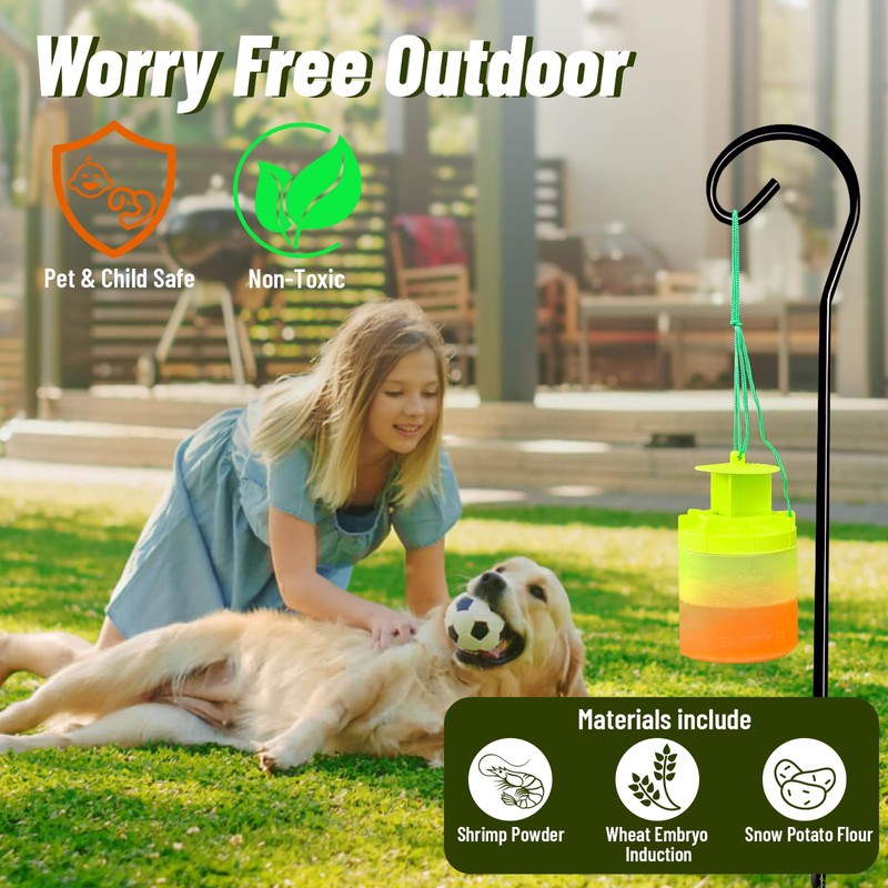 • Safe for Children & Pets Bait: The fly trap's bait is made from non-toxic food-grade materials(shrimp powder, wheat embryo induction, snow potato flour,etc) that's harmless to families and pets, designed for worry-free use in outdoor living spaces when used as directed