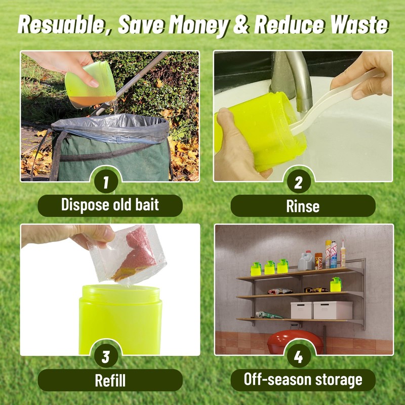 • Reusable & Weatherproof Design: Built with durable, all-weather materials to withstand sun, rain, and wind. Simply empty, rinse, and refresh with bait refills for season-long fly control—no replacement needed