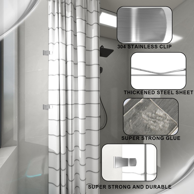 - Durable Material - Shower curtain clips are made of 304 stainless steel for strength and durability. There are no metal pieces or sharp edges, so you won't have to worry about rust or painful cuts. Will not corrode. Strong adhesive backing so that the shower curtain holder will not come off easily.