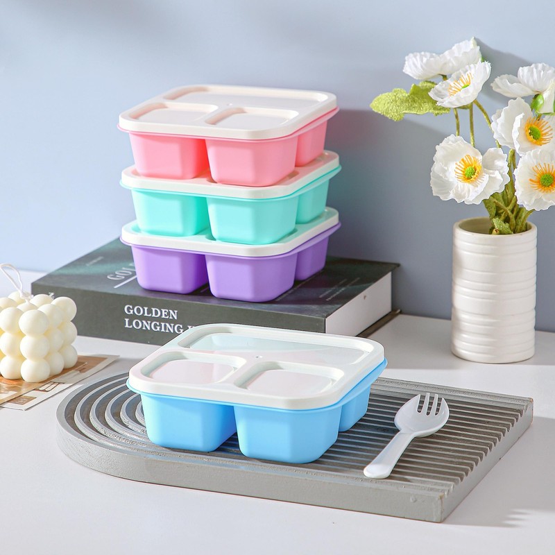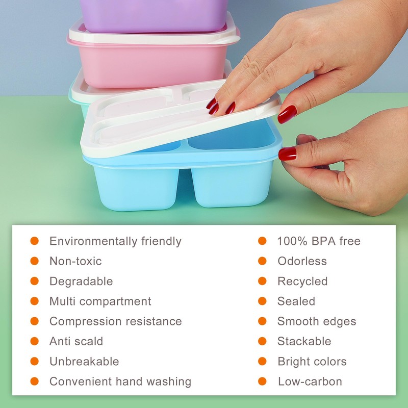 • 【Cost-effective Snack Containers Pack of 4】:You will receive bento lunch box pack of 4, with 4 colors - pink, purple, blue and green. The size is approximately 6.7 x 6.1 x 2.2inches. Sufficient quantity and style of lunch containers can meet various daily needs, three perfectly portioned compartments can balanced distribution of food without confusion. Snackle box containers suitable for school, office, camping and travel.