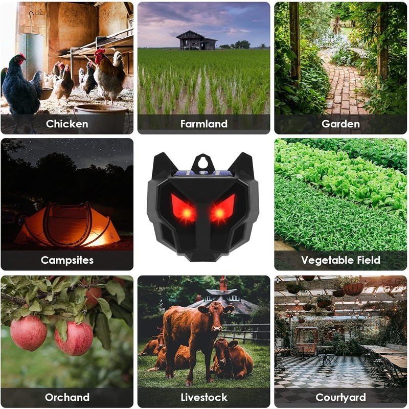 - Solar Animal Repellent: The nocturnal animal deterrent have done a great job in deterring predators.It will effectively protect your garden, yard, chicken coops, livestock, nurseries, manors, orchards and more other properties