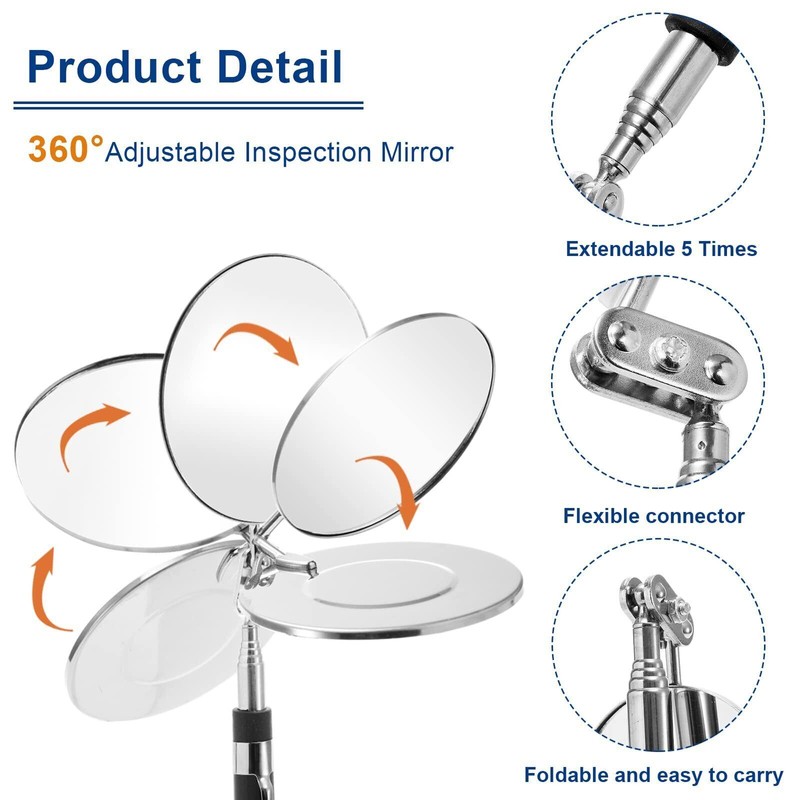 - Design: Detachable inspection mirror equips the telescoping rod, easy to extend and retract for observing hard to reach areas and the 360 degree swivel rotating mirror for optimal viewing from every angle very useful tool for your inspection needs.