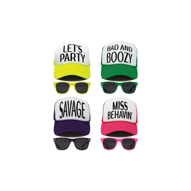 4 Pack: Trucker Hat & Sunnies - Boozy Pack (bad and boozy, let's party, miss behavin, savage)