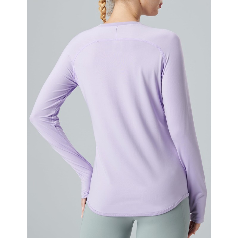 - All-Day Performance: These crewneck workout tees offer a flattering fit with raglan sleeves for freedom of movement, thumbholes to secure sleeves in place, and a curved hem for extra coverage; Ideal for running, hiking, and other sports