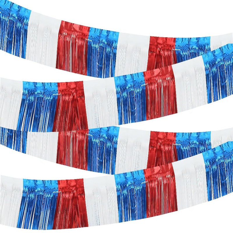 - 4 Packs 10 Feet Long Foil Fringe 4th of July Garland Memorial Day USA Red White Blue Independence Day Tinsel Metallic Patriotic Wall Hanging Banner for Car Parade Floats Garden Decorations