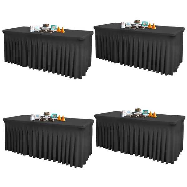 4 Packs Black Table Clothes for 8 Foot Rectangle Tables, One-Piece Wrinkle Resistant Stretch Spandex Table Covers with Skirt for Event Banquet Wedding Birthday Party