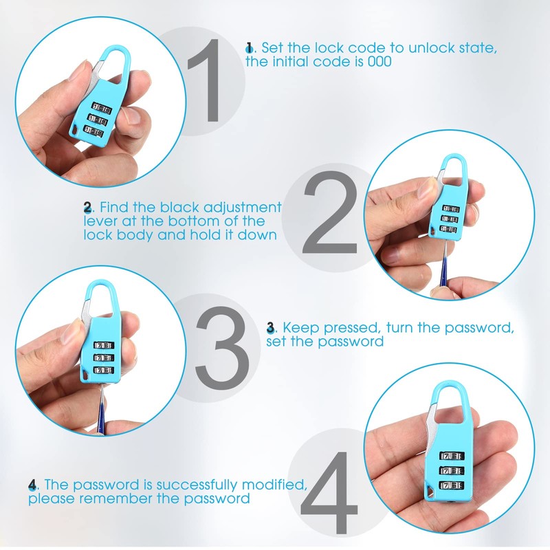 - Use: First, set the code of the padlock lock compartment to the unlocked state (initial code 000), secondly, find and hold the black code lever at the bottom of the lock body, third hold down, rotate the code, and set the code, fourth, change the password successfully, please remember the password