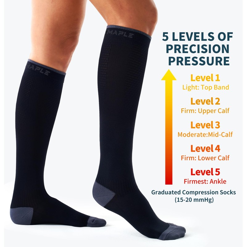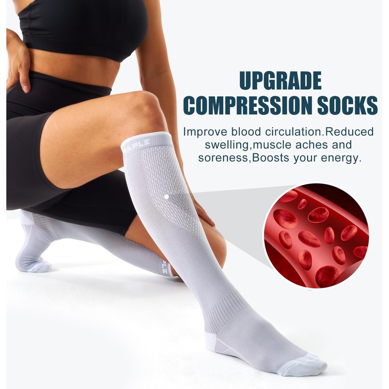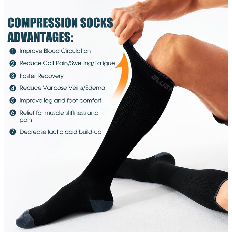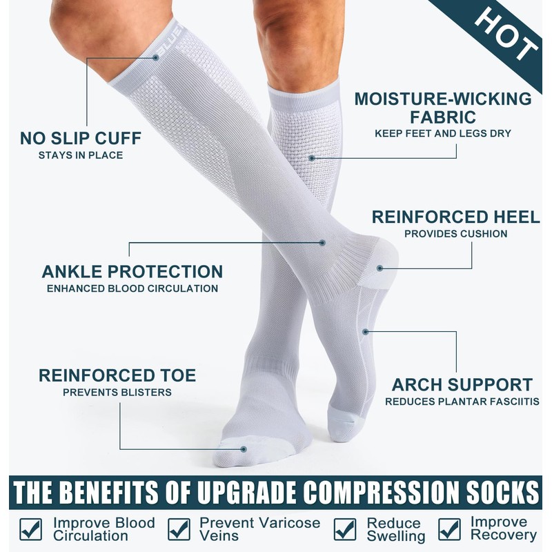 • [Targeted Compression & Muscle Support]:Featuring five-zone graduated compression (15-20 mmHg),our socks optimize blood flow,reduce swelling and provide precise support to critical areas like the plantar fascia and Achilles tendon.They effectively alleviate shin splints,muscle stiffness and fatigue while promoting faster recovery and preventing blood pooling.Perfect for athletes,professionals,or anyone seeking enhanced leg health.