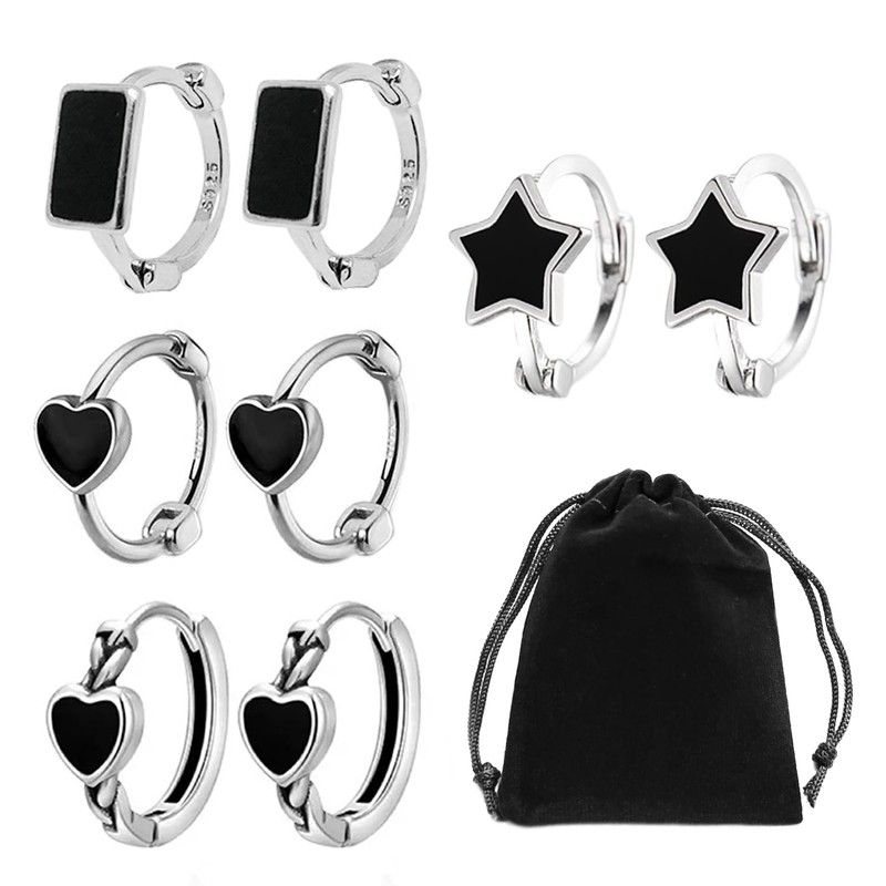 4 Pairs Of Black Huggie Earrings Set, Comes With 1 Storage Bag,Heart Earrings,Hoop Earrings For Women ,Silver Earrings,Copper Earrings,Heart, Rectangular, And Five-Pointed Star Styles, Unisex.