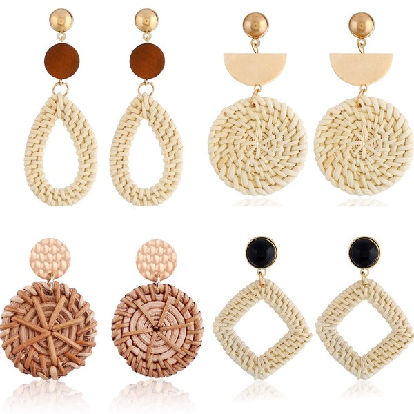 • HANDMADE: The straw wicker rattan earring set contains 4 pairs of drop dangle earrings in different styles, handcrafted from high quality wood materials wicker and rattan. The production is fine and the materials are taken from nature, pollution-free and environmentally friendly