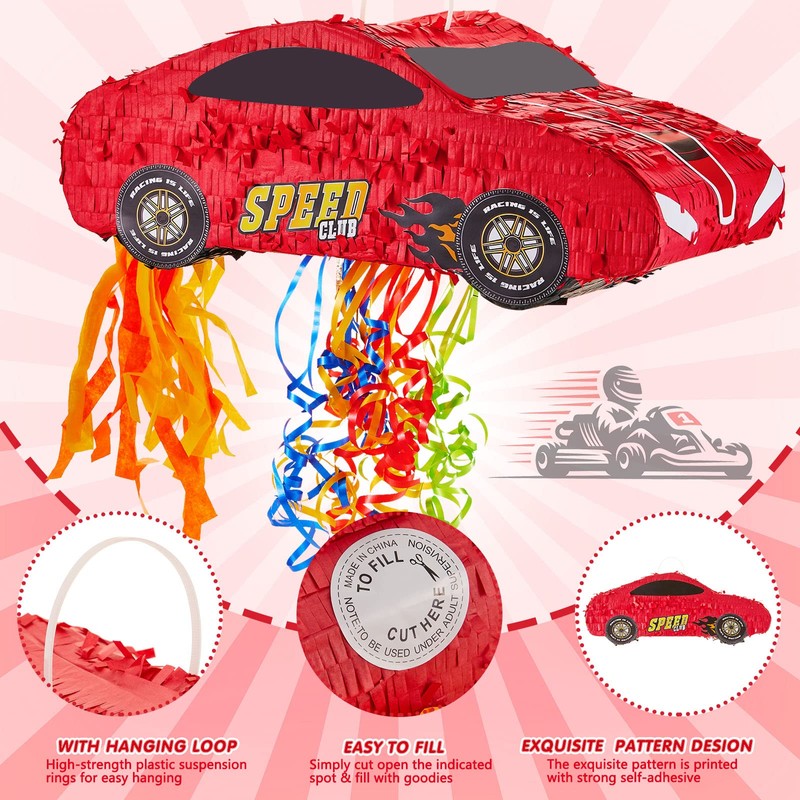 - Attractive Design: this race car pinata is designed with a racing theme, cool and eye catching; The red tone is easy to attract your guests' attention at a themed birthday party, and it would be more fun to hit the pinata with a bat