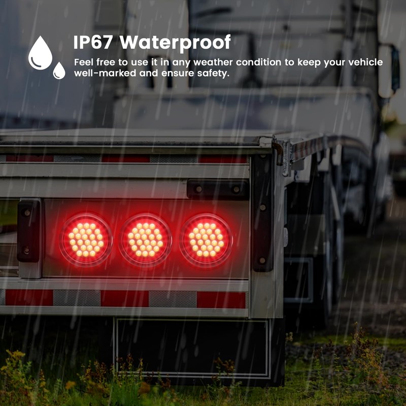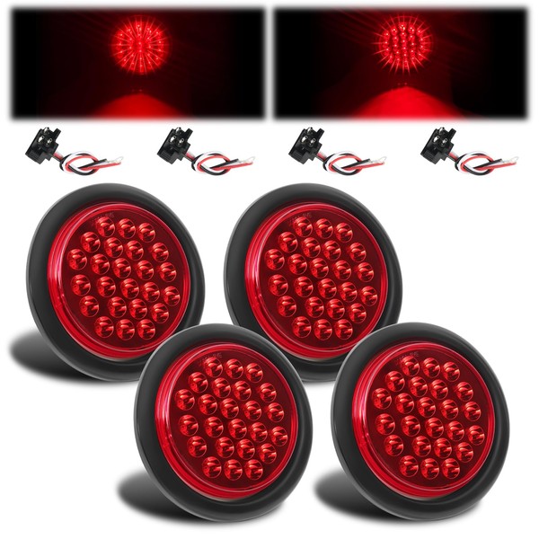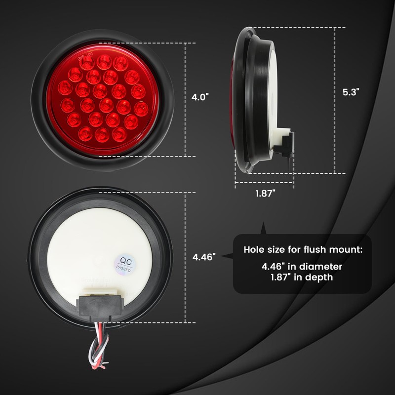 - 【4-Pack 4" Round Red LED Tail Lights - 24 High-Intensity LEDs】24 super-bright LEDs per light deliver 200% brighter output than 12-LED models, serving as stop/turn/brake lights and running/marker lights. 4"" inner diameter with 5.3"" grommet ring—drill 4.6"" hole for flush mount installation.