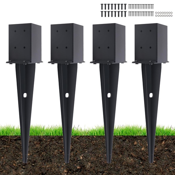 4 Pcs 4 "x 4 "Fence Post Anchors Ground Spike (Actual 3.6 ” X 3.6”),Heavy Duty Metal Fence Stakes Post Base 22'' with Black Powder Coated Support for Mailboxes, Fences, Trellis Posts, Banners.