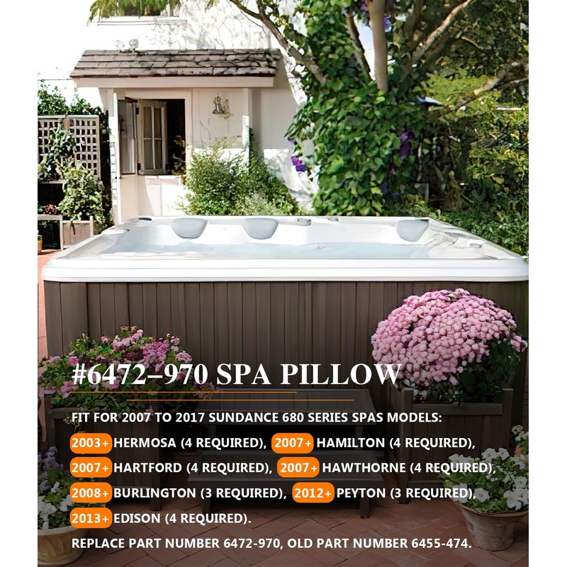 - Wide Application - Our #6472-970 Spa Pillow fit for the following models: 2007 to 2017 Sundance 680 Series Spas, 2003+ Hermosa (4 Required), 2007+ Hamilton (4 Required), 2007+ Hartford (4 Required), 2007+ Hawthorne (4 Required), 2008+ Burlington (3 Required), 2012+ Peyton (3 Required), 2013+ Edison (4 Required). Replace Part Number 6472-970, Old Part Number 6455-474.