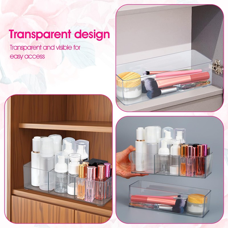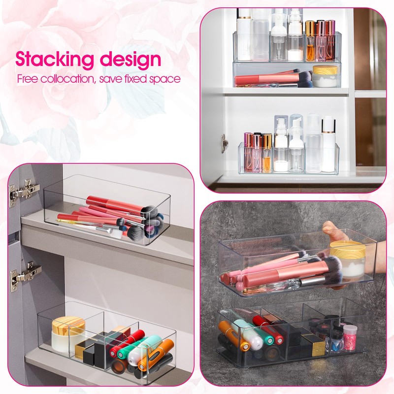 - Packaging Information: 4-piece set, equipped with 2 storage boxes and 2 three-compartment storage boxes. Stackable design, save desktop space. Transparent design, easy to use. It is a great choice to increase storage space on bathroom countertops, vanities, etc.