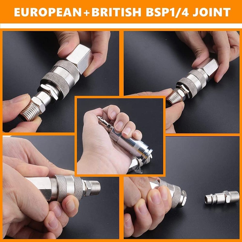 - Package:PCL Male quick release fitting with 1/4" BSP male thread,Euro Female quick release fitting with 1/4in BSP female thread,Euro Male quick release fitting with 1/4" BSP male thread,PCL Female quick release fitting with 1/4" BSP female thread,4 pcs in total for 1 set.