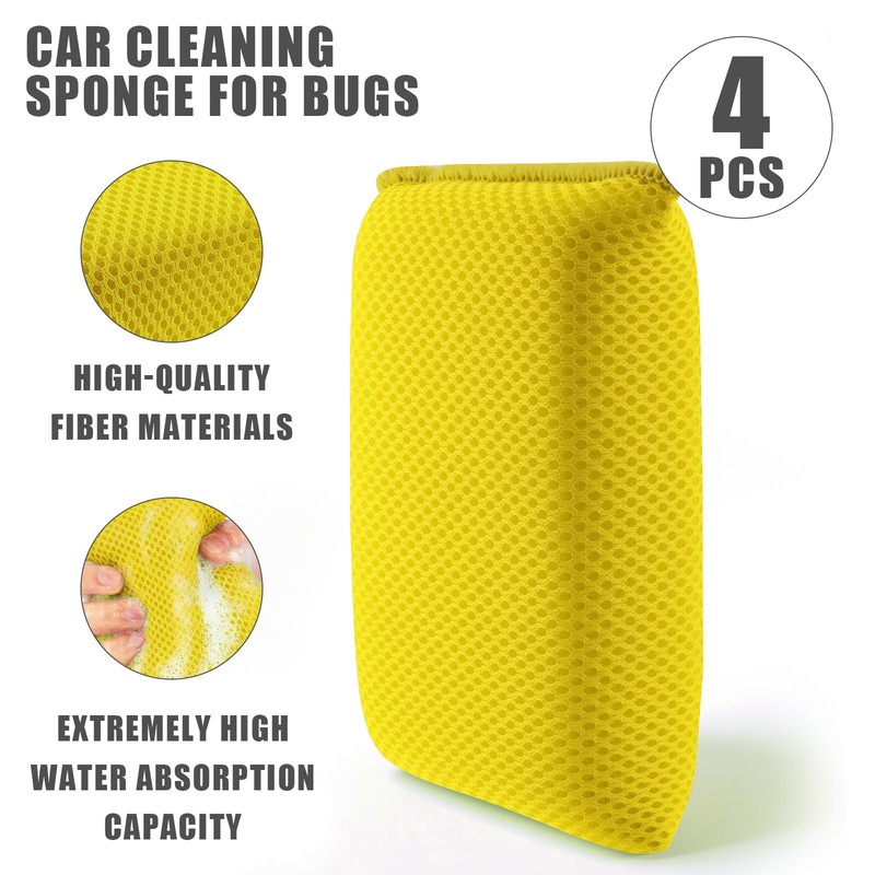4 PCS Bug Scrubber Sponge Car, Bug Remover Wash Sponge,Car Cleaning Sponge for Bugs, Tar, Grime - Paint-Safe, Reusable Wash Sponges Kit(Yellow)