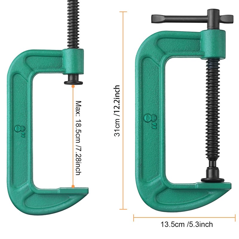 - Size- The jaw opening of c-clamp is 8 inch/ 20 cm and Up to 3 - 3/8 inch/ 8.6 cm throat depth; Clamping force: 5900 lbs