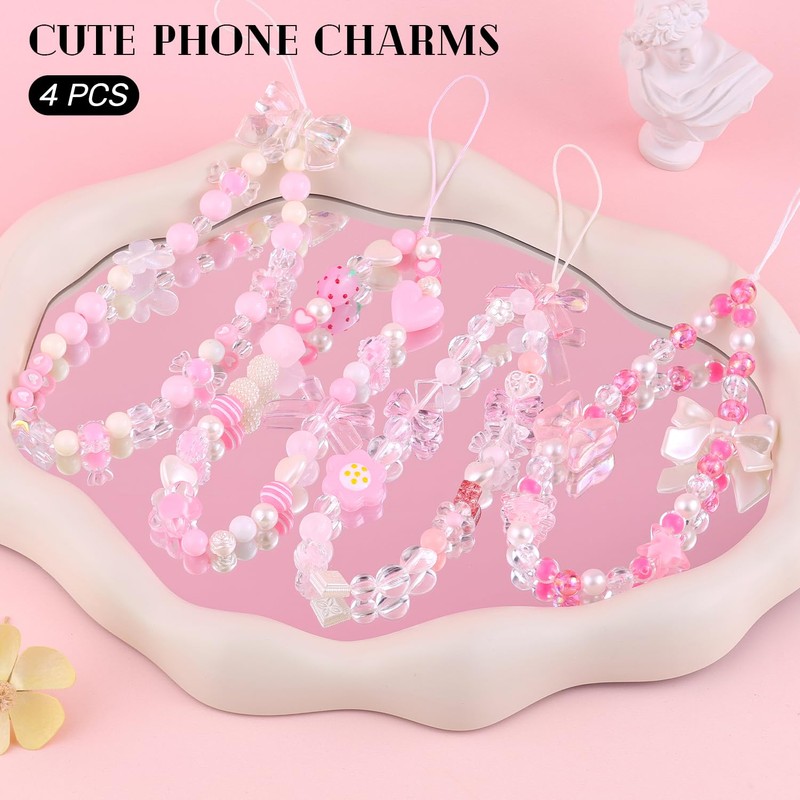 4 PCS Cute Phone Charms Aesthetic Y2K Cellphone Wrist Strap Bedazzling Bear Bow Butterfly Flower Heart Star Accessories Pink Beaded Phone Chain String for Bag Keychain Airpods Camera Pendants Decor