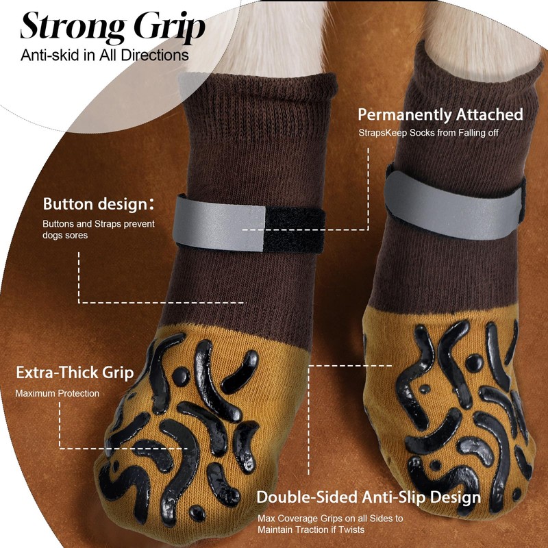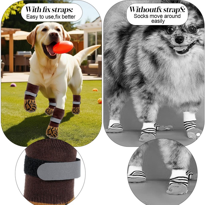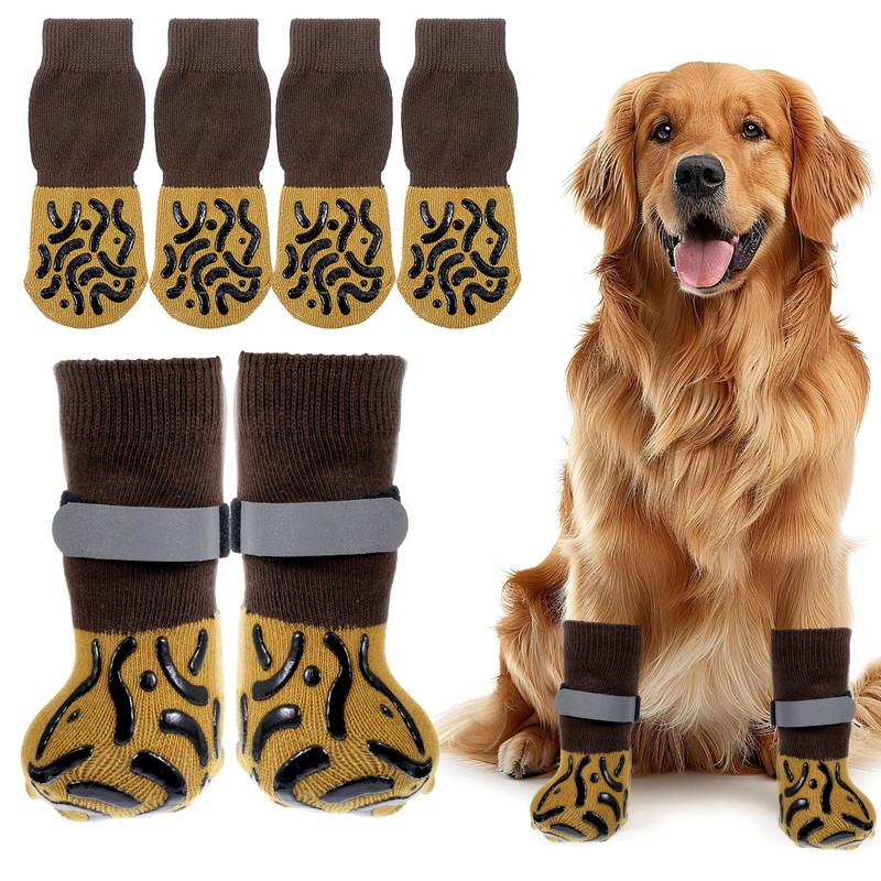 Ensure comfort and safety for every step with our dog socks! These 4 pieces feature stretchy cotton fabric for a snug yet flexible fit. Always measure your pet’s paws before purchase—if between sizes, size up for optimal comfort. Each sock boasts 360° Double-Side Grip Technology, with silicone patterns covering all sides to prevent slips on smooth surfaces—even if the sock twists. Senior dogs especially benefit from the supportive, durable fabric that enhances mobility, reduces anxiety, and deters excessive licking. Adjustable straps lock the socks securely in place, eliminating slips during play or walks. Perfect for all ages and breeds, these versatile socks protect paws from hot pavements, icy terrain, and pointed debris while protecting floors from scratches and keeping homes clean. Give your companion confidence on any adventure!