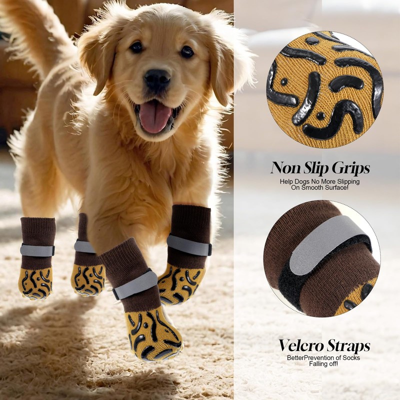 4 Pcs Dog Socks to Prevent Licking Paws, Dog Booties for Hot Pavement, Double Side Non Slip Pattern Dogs Socks, Dogs Booties for Hardwood Floors Anti Slip Caramel (Small)