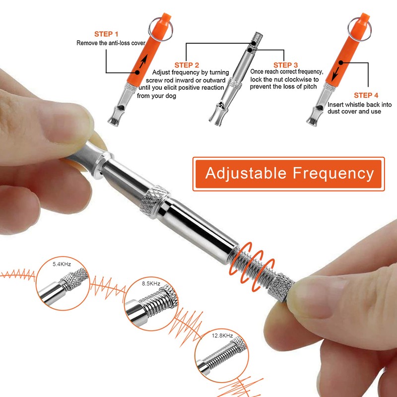 - đ€ăAdjusable FrequenciesăThe dog whistle to stop barking has a nut and screw, adjust frequency by turning screw rod inward or outward until your dog exhibits the strongest reaction.