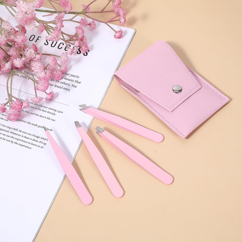 4 Pcs Eyebrow Tweezers with Flat Sloped Pointed Scissor Tips, Portable Tweezer Set for Traveling, Pink Eyebrow Tweezers for Women, Precision Tool for Brow, Facial Hair, and Ingrown Hair Removal
