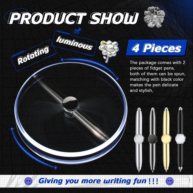 4 Pcs Fidget Pen Spinner Pen with LED Light Multi Functional Cool Anxiety Pen Help Stress Reducer Thinking Ballpoint Pen Rotating Anti Stress Anxiety Gift Pen for Business (Black, Gray, Gold, Silver)