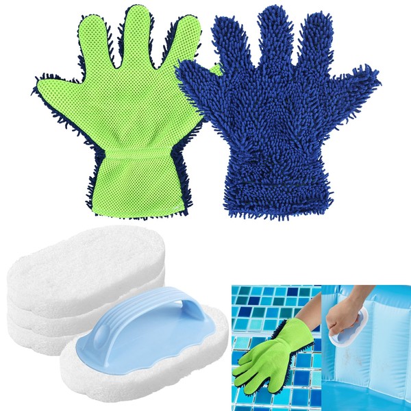 - Total Cleaning Solution: You will receive 2 pool cleaning gloves and 4 pool cleaning brushes (1 handle and 4 replacement sponge pads) to easily handle all types of daily cleaning needs. The gloves measure 11.5 x 5.5 inches and fit most hands comfortably and are easy to change.