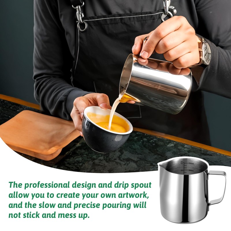 - Precision Measurement & Control: Clear 350ml capacity markings ensure accurate milk portioning for consistent latte art results, featuring a pointed spout design that integrates barista tools functionality for mess-free pouring and intricate foam patterns