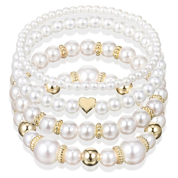 4 Pcs Pearl Bracelets for Women, White Gold Stretch Bridesmaid Pearl Bracelets Bridal Wedding Elastic Bracelets Stackable Faux Pearl Bracelets for Women Wedding Jewelry Lady Pearl Beaded Bracelets