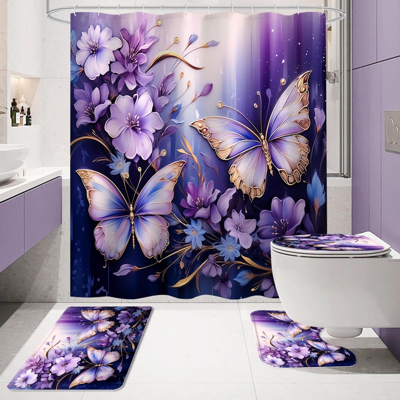 4 Pcs Purple Floral Butterfly Shower Curtain Set with Non-Slip Rugs, Modern Toilet Lid Cover and Bath Mat, Elegant Bathroom Decor Set with Shower Curtain and Rugs(Hooks Not Included)