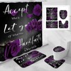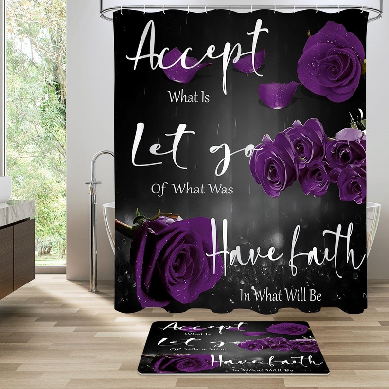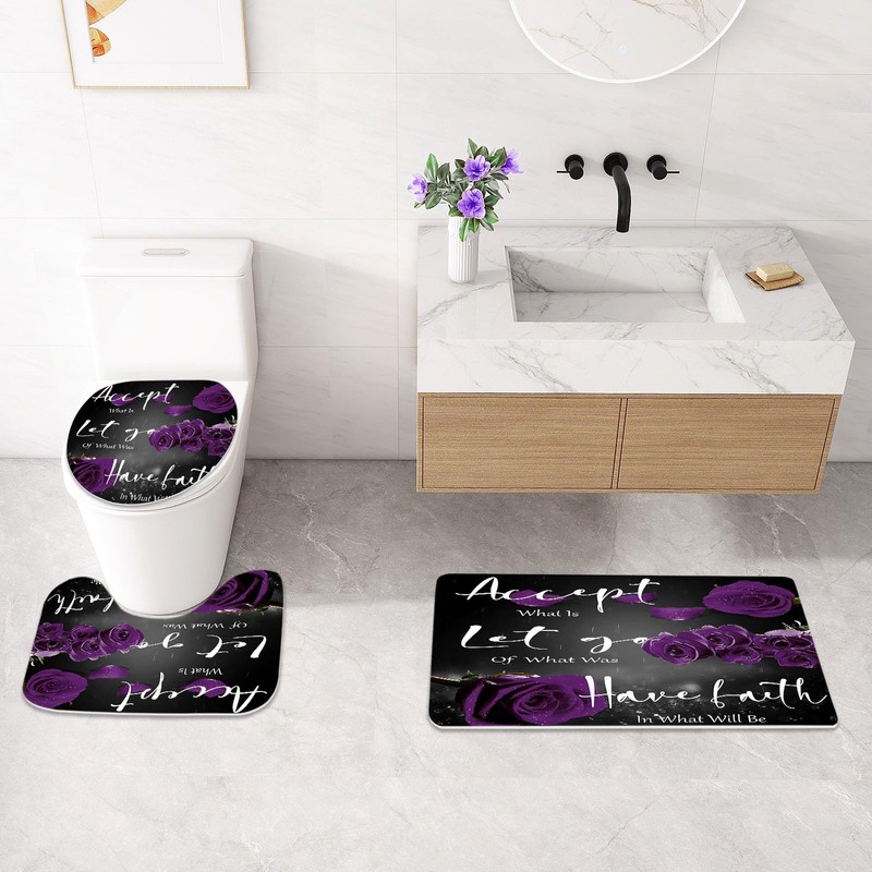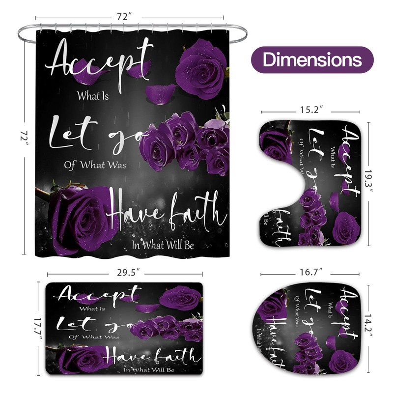 4 Pcs Purple Rose Shower Curtain Sets with Non-Slip Rug, Toilet Lid Cover, Bath Mat, Grateful Blessed Black Purple Retro Elegant Shower Curtain Valentine's Day Bathroom Set(Hooks Not Included)