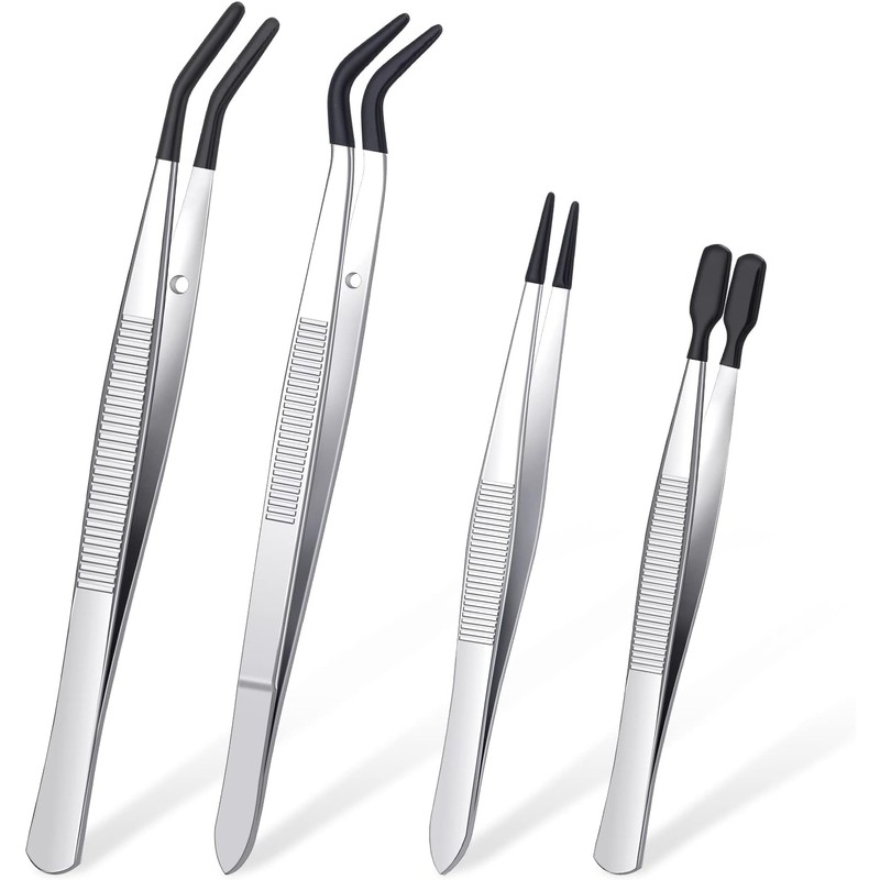 - Complete Set: This set includes 4 different types of rubber tipped tweezers, including 1 rubber fine point tweezer, 1 rubber flat tip tweezer, and 2 long bent tweezers. These tweezers for crafting are perfect for various tasks, ensuring you have the right tool for every job