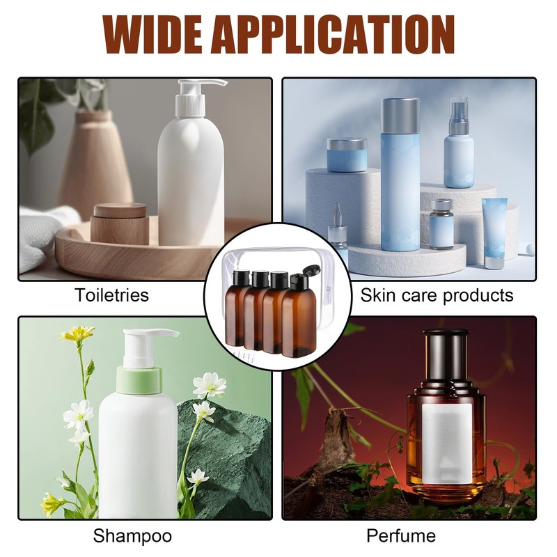 - CONVENIENT SET WITH STORAGE BAG: Includes 4 brown travel toiletry bottles, a clear storage bag, and a label sheet. Perfect for shampoo, conditioner, lotion, or any personal care product to keep everything tidy