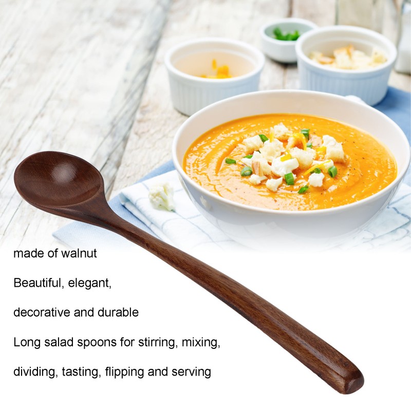 1、Material: This wooden cooking spoon is made of walnut wood, which is more beautiful, elegant, decorative and durable than other spoon woods. 2、Versatile: Long salad spoon for stirring, mixing, dividing, tasting, flipping and serving. 3、Suitability: Wooden cooking spoons are suitable for hot and cold dishes, liquid and hard diets. 4、Easy To Grip: Eco friendly and non toxic. Safe non stick cookware with comfortable and easy to grip handles. 5、Exquisite: The unique texture and quality of walnut makes the spoon like a work of art, adding a beautiful look to the kitchen.