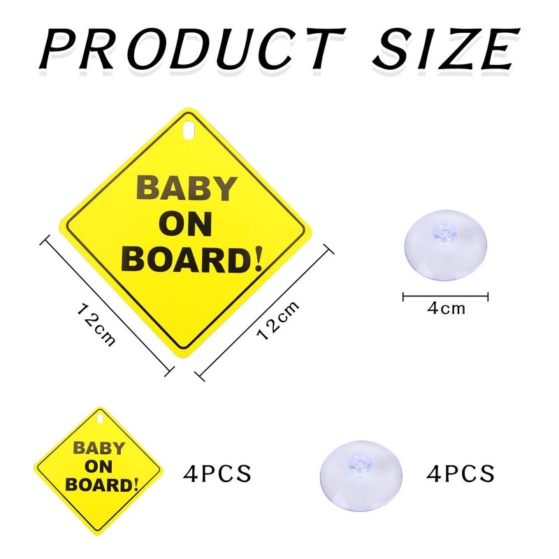 - 【Product Content】You Will Receive 4 Pieces Of Baby Signs In The Car. Each Warning Sign Is 12X12Cm In Size And Yellow In Color, Suitable For Car Warnings And Decorations. At The Same Time, You Will Also Get 4 Suction Cups, The Suction Cups Are 4Cm In Diameter And Transparent In Color, Suitable For Fixing Warning Signs.