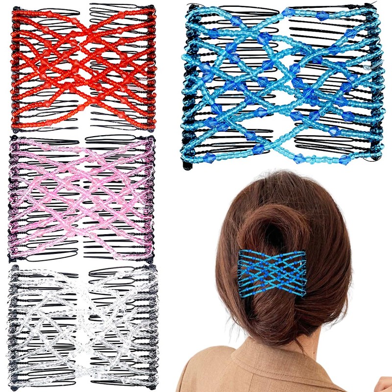 4 Pieces Elastic Hair Comb Clips Magic Stretchy Double Comb Hair Clips for Girls Women Hairstyle Hair Accessories (Beads-Pink,Red,White,Blue)