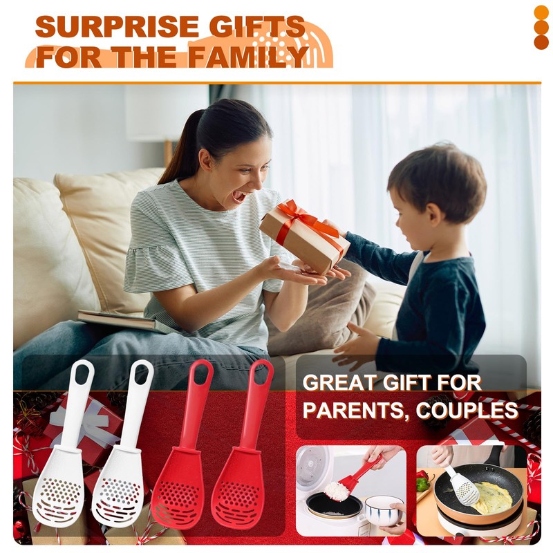 4 Pieces Multifunctional Kitchen Cooking Spoon, Plastic Slotted Spoon with Long Handle, Heat Resistant Strainer Scoop for Dripping, Mashing, Grinding, Separating (Red, White)
