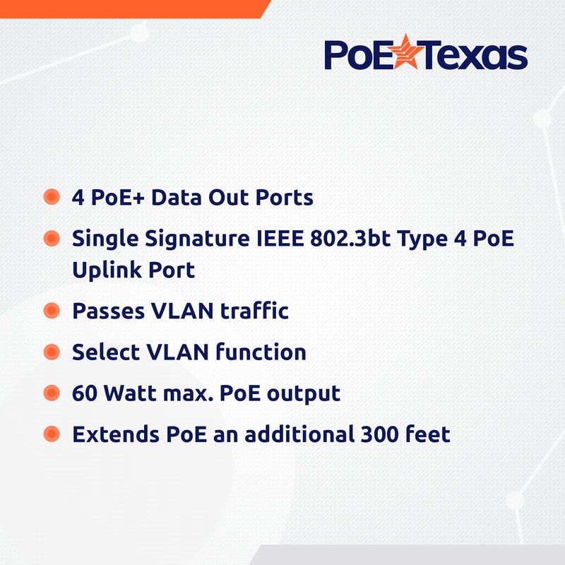 - Power this PoE powered switch via the uplink port with an existing 802.3bt switch or a 55V 60W power supply like our BT-1-55v60w-IN midspan injector. Toggle to pass VLAN traffic (V) or to extend PoE an additional 300 feet (S) with auto detection on all 4 Out ports.