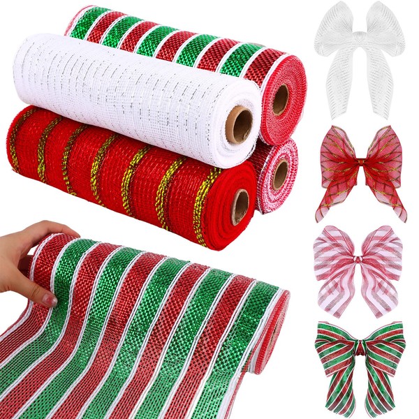 4 Rolls Christmas Poly Burlap Mesh 10 Inches, 40 Yards Metallic Deco Mesh Ribbon for Wreath Christmas Tree, Red White Green Mesh Ribbons for Christmas Tree New Year Winter DIY Crafts Wreath Party Wrapping Craft