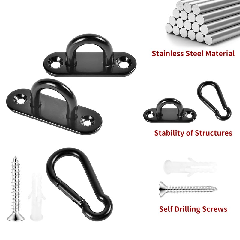 • 【Package Content】4 black pad eye plates, 4 black carabiner clips, 8 black screws and 8 plastic plugs . U shape anchor plates with carabiner clips combination widely used on small yachts and boats bolt, roof beam, ceiling fan hook and wood.The package includes a sufficient number of hooks, ensuring you have enough for multiple applications or replacements,u brackets for mounting,wall anchor.