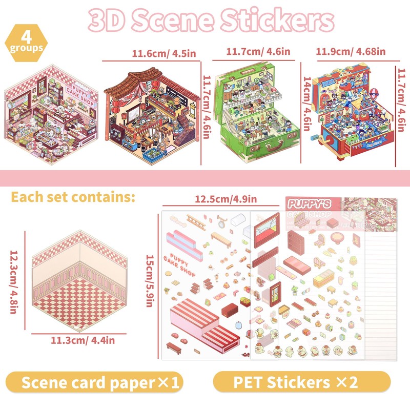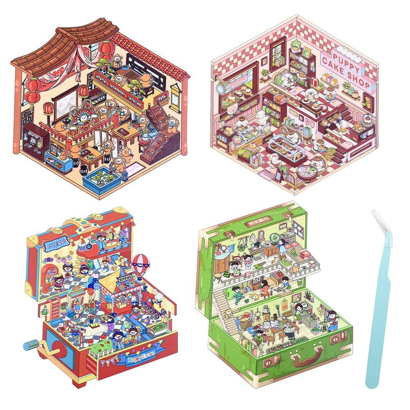 - 【 Variety of Scenes 】 3D stickers house contain four scenes, including monkey opera, curly puppy dessert shop, clown circus, and time travel box. You can create various scenes to meet your creative needs.