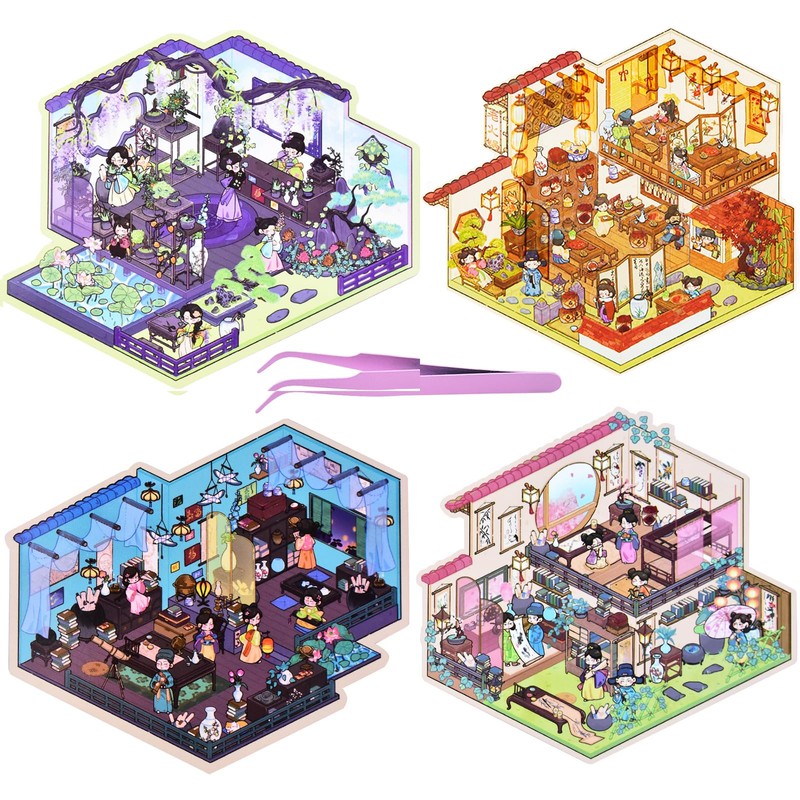 4 Sets Ancient 3D House Stickers with Tweezers DIY 3D Sticker Scene Cute Make Your Own Mini Room Scenes Miniature Scene Stickers for Relief Stress Pass The Time